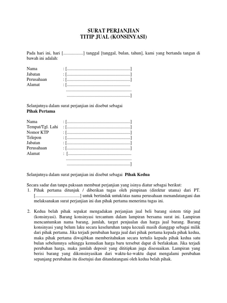 Contoh surat perjanjian konsinyasi. Pasal 1 barang konsinyasi tercantum dalam lampiran yang merupakan satu kesatuan yang tidak dapat dipisahkan dengan perjanjian ini. Surat perjanjian dibuat dan ditandatangani oleh kedua belah pihak secara sadar dan tanpa tekanan dari pihak manapun di jakarta pada hari tanggal dan bulan seperti tersebut di atas. Kedua belah pihak sepakat mengadakan perjanjian jual beli barang dengan sistem titip jual konsinyasi dengan ketentuan dan syarat syarat sebagai berikut. Surat perjanjian titip jual konsinyasi pada hari ini kamis tanggal 01 bulan november tahun 2018 di magelang jawa tengah telah diadakan perjanjian antara. Tentunya dengan adanya surat perjanjian kerjasama konsinyasi ini akan mengatur dan mempermudahkan dalam pembagian keuntungan dalam suatu bisnis yang. Thursday november 1 2018 add comment edit.