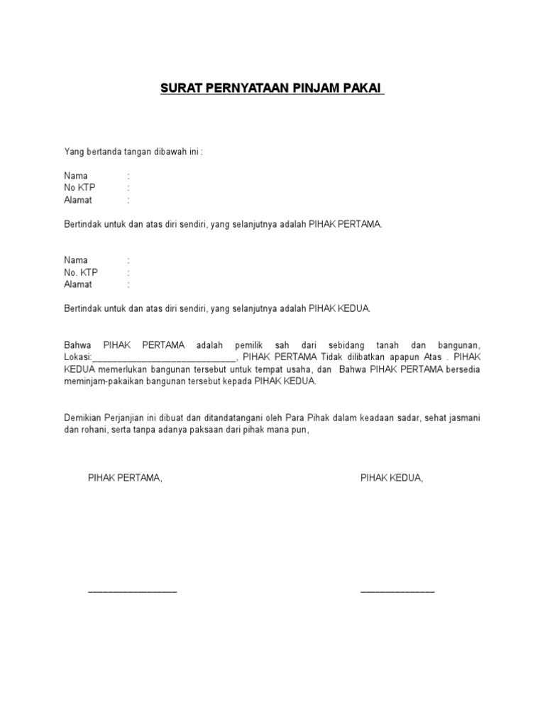 Contoh surat perjanjian pinjam pakai tanah. Surat perjanjian pinjam pakai tanah. Perjanjian pun bisa dibuat dengan cara lisan dan cara tertulis. Surat perjanjian pinjam pakai adalah surat perjanjian antara pihak yang meminjamkan barangaset pemberi pinjaman kepada pihak peminjam untuk digunakan secara gratis dengan ketentuan bahwa peminjam wajib mengembalikan barangaset yang dipinjam tersebut telah dipakai atau setelah sampai jangka waktu tertentu sebagaimana yang diperjanjikan. Namun agar lebih terstruktur dan memiliki bukti fisik maka kedua belah pihak biasanya akan menggunakan surat perjanjian. Surat perjanjian ini adalah salah satu dokumen format. Contoh surat perjanjian hutang piutang dengan jaminan sertifikat tanah surat perjanjian sangat diperlukan sebagai bukti otentik jika 2 dua atau lebih orang masuk ke dalam kesepakatan atau kesepakatan yang baik di bidang bisnis dan hal hal lain di mana mungkin ada perselisihan di masa depan.
