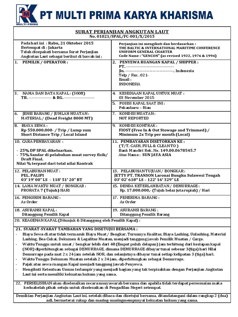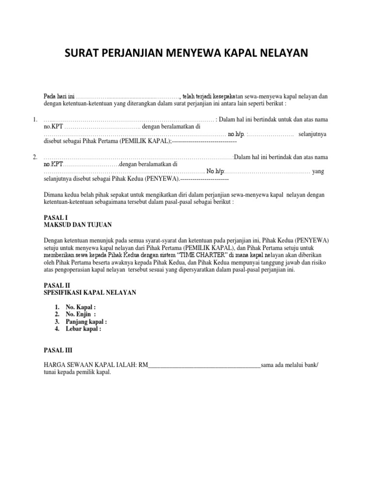 Contoh surat perjanjian sewa kapal. Demikian surat perjanjian sewa menyewa kapal dibuat dan disetujui bersama ditandatangani dalam rangkap dua bermaterai cukup dan masing masing mempunyai kekuatan hukum yang sama pihak pertama pihak kedua pemilik kapal atau wakilnya. Sebuah perusahaan yang berkedudukan hukum di beralamat dalam perjanjian ini di wakilkan oleh bapakibu. Tahun dua ribu sebelas 2011 bertempat di jakarta kami yang bertanggung jawab dibawah ini. Great contoh surat perjanjian freight charter kapal 61 guna ide membuat surat perjanjian oleh post contoh surat perjanjian freight charter kapal semoga dengan gawe cv post beberapa contoh dapat menjadikan anda lebih baik lagi dalam berkreasi serta menulis surat yang baik dan menarik. 2 responses to contoh perjanjian sewa menyewa kapal unknown 24 maret 2016 2129. Admin adakah contoh surat perjanjian kontrak sewa jasa perwira untuk menakhodai kapal tug boat.