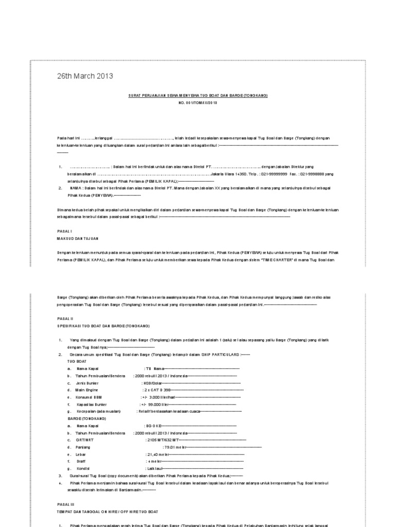Berikut ini contoh surat yang baik dan benar serta menarik perhatian yang dapat anda gunakan dalam tema maupun format penulisan surat. Contoh surat perjanjian freight charter kapal gawe cv. Perjanjian sewa menyewa kapal. Perjanjian sewa menyewa time charter tug boat dan barge nomimtc2011 pada hari ini. Sebab diketahui bahwa alat berat merupakan salah satu objek transportasi yang memiliki nilai ekonomi yang tinggi yang bahkan hingga bernilai miliaran. Dengan ketentuan menunjuk pada semua syarat syarat dan ketentuan pada perjanjian ini pihak kedua penyewa setuju untuk menyewa tug boat dari pihak pertama pemilik kapal dan pihak pertama setuju untuk memberikan sewa kepada pihak kedua dengan sistem time charter di mana tug boat dan barge tongkang akan diberikan oleh pihak.