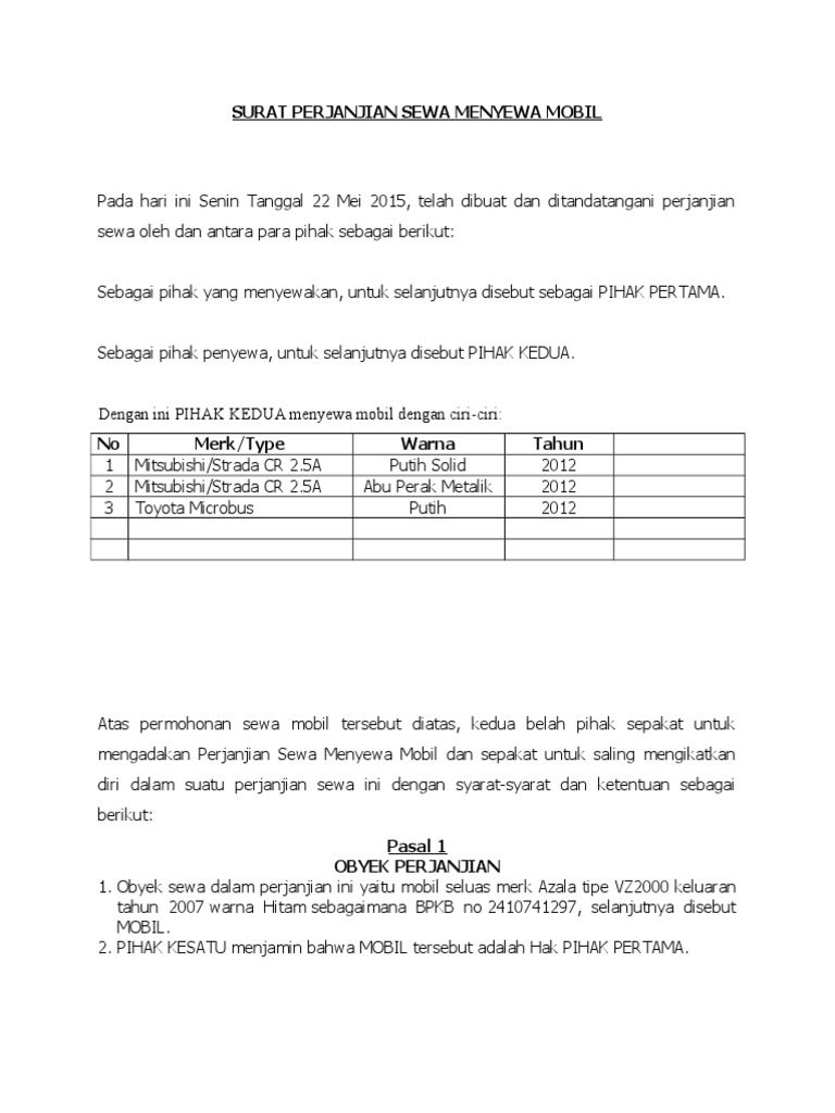 Contoh surat perjanjian sewa menyewa mobil. Surat perjanjian sewa menyewa mobil. Surat perjanjian sewa mobil. Manager marketing alamat. Seperti surat perjanjian lainnya tentu saja terdapat beberapa parameter yang perlu diperhatikan ketika menyusun surat perjanjian sewa mobil yang baik dan benar ini. Jadi surat perjanjian sewa menyewa ini tidak hanya untuk rental mobil harian atau bulanan saja. Atau untuk surat perjanjian sewa bis surat perjanjian sewa mobil bak angkutan barang dll.