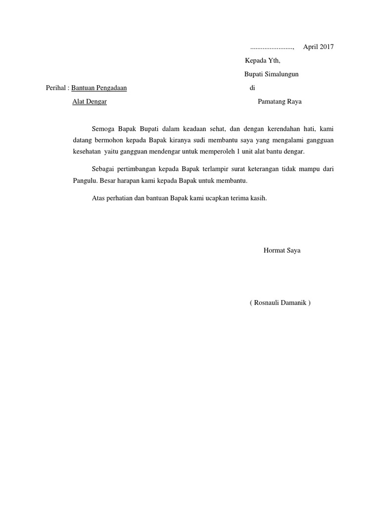Contoh surat permohonan bantuan alat. Jika anda ingin mengetahui lebih jelas dan lengkap mengenai bagaimana cara membuat surat permohonan bantuan simak rangkuman lengkapnya berikut ini. Contoh surat permohonan bantuan beasiswa2. Namun jika anda ingin mengajukan bantuan dana kepada pihak lain yang merupakan pihak kelompok ataupun perseorangan penggunaan kop surat atau kepala surat wajib untuk anda penuhi sebagai identitas dari pemohon bantuan. Surat permohonan bantuan masih pada waktu yang sama admin masih membahas ulasan artikel seputar dunia surat. Surat permohonan bantuan alat berat patarsono saturday april 26 2014 surat permohonan bantuan alat berat. Contoh surat permohonan setiap orang pasti pernah mengalami kesulitan entah seberapa matang rencana yang telah dibuat.