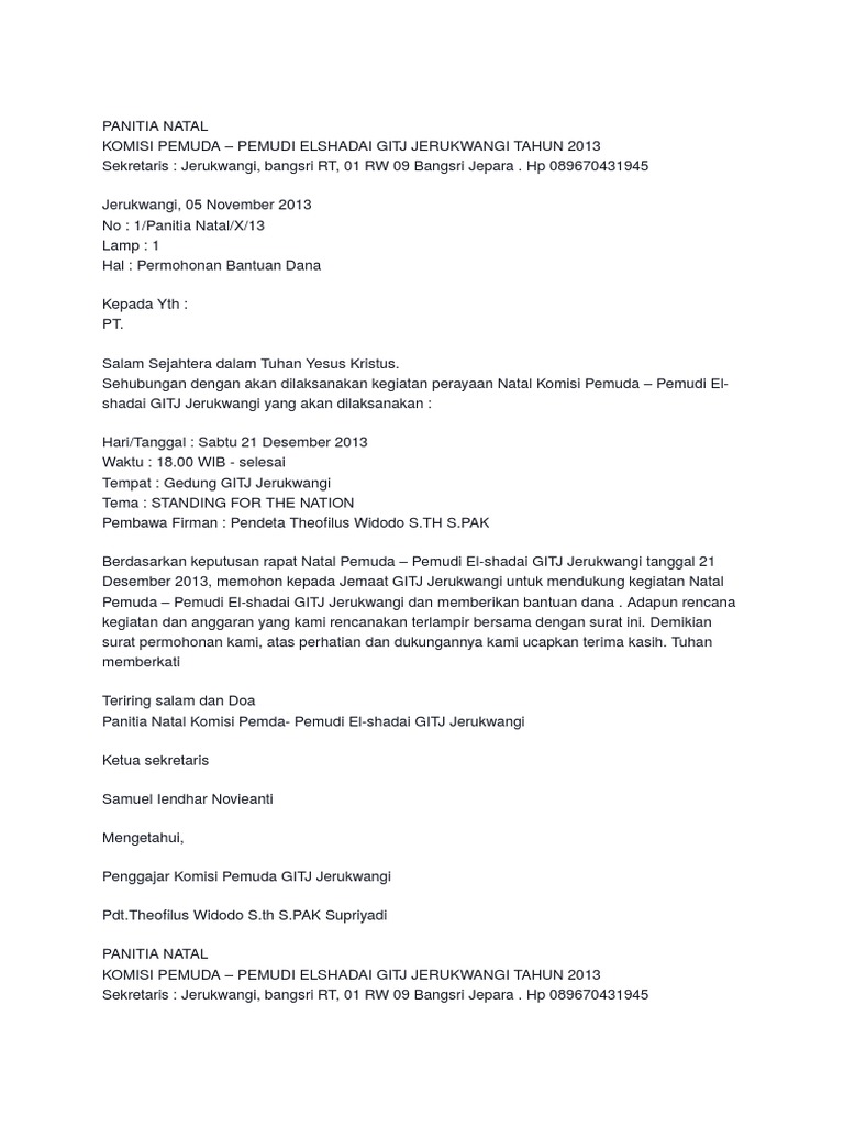 Contoh surat permohonan bantuan dana yang baik kumpulan contoh surat laporan pertanggungjawaban panitia pembangunan gereja 2013. Semua bantuan dan partisipasi dari seluruh pihak sangat kami harapkan demi kelancaran kegiatan ini. Dengan hormat berkenaan dengan akan diadakannya natal bersama mahasiswai program matrikulasi kabupaten pegunungan bintang papua di universitas sanata dharma yogyakarta maka kami datang ke hadapan bapak guna mengajukan permemohon bantuan dana untuk dalam rangka hari raya natal maka kami akan mengadakan kegiatan natal bersama mahasiswai program matrikulasi kabupaten pegunungan bintang papua. Kumpulan contoh proposal usaha wirausaha pengajuan usaha pendidikan permohonan bantuan tugas buat proposal hewan kurban penelitian. Contoh surat permohonan pemakaian gedung gereja untuk natal 13 contoh proposal yang benar usaha kegiatan sekolah pengajuan. Surat permohonan bantuan dana juga seringkali kita temukan pada lingkungan sekitar kita.