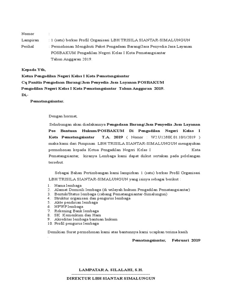 Contoh surat permohonan bantuan hukum kepada lbh. Surat permohonan berisi tentang sebuah permintaan tentang sesuatu hal kepada pihak yang bersangkutan perseorangan badan atau lembaga organisasi perusahaan atau instansi dan lainnya. Di dalam peraturan tersebut memberikan pengertian mengenai bantuan hukum secara cuma cuma yaitu jasa hukum yang diberikan advokat tanpa menerima pembayaran honorarium meliputi pemberian konsultasi hukum. Sebagaimana yang sudah diketahui bahwa surat permohonan berisi tentang sebuah permintaan tentang sesuatu perihal kepada pihak yang bersangkutan baik perseorangan badan ataupun lembaga berupa organisasi perusahaan maupun instansi dan lain sebagainya. Sebagai negara hukum penegakan hukum. Agar permohonan tersebut dikabulkan ada saatnya kamu akan meminta atau memohon bantuan kepada orang lain dan biasanya harus mengajukan surat permohonan. 04 tanggal 13 januari 2017 y ang dibuat di notaris ayu syakira sh sk menkeh dan ham no.