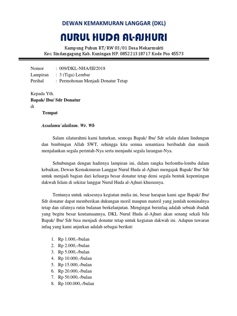 Atau bisa juga dikatakan orang tersebut sebagai penyumbang tetap. Selanjutnya kami sebagai keluarga besar pondok pesantren miftahul huda iii bermaksud untuk mengajukan permohonan untuk menjadi donatur tetap pondok pesantren miftahul huda iiidikarenakan kami merasa bahwa pentingnya kerjasama antara pihak pesantren dengan berbagai kalangan masyarakat untuk memajukan syar agama islam yang kita cintaidana yang tersimpan insya alloh akan dialokasikan untuk. Contoh surat donatur tetap have a graphic associated with the othercontoh surat donatur tetap in addition it will include a picture of a sort that may be observed in the gallery of contoh surat donatur tetap. 15 contoh surat permohonan dana paling lengkap aktivitas surat menyurat dalam lembaga atau organisasi tentunya tidak bisa ditinggalkan. Surat juga menunjukkan penghormatan kepada orang yang ditujukan. Contoh formulir donatur tetap.