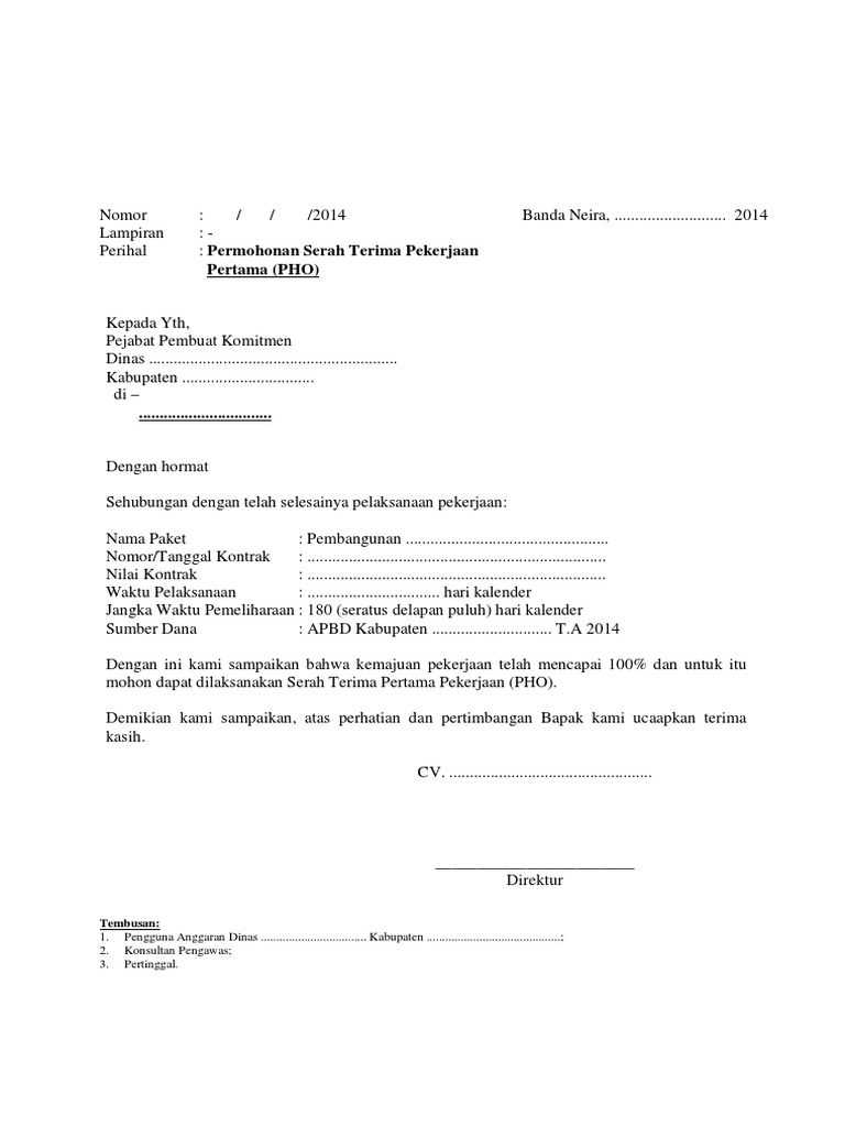 Contoh surat permohonan fho proyek. Demikian beberapa contoh surat permohonan fho untuk beberapa jenis pekerjaan. Semoga bisa bermanfaat bagi anda yang sedang ingin megajukan uji lapangan terhadap proyek yang telah anda kerjakan. Contoh surat permohonan fho. Pengajuan pho diajukan oleh pihak kontraktorpenerima pekerjaan ke dinas terkaitpihak pemberi pekerjaan setelah proyek selesai 100. Pho sering juga disebut dengan serah terima pekerjaan pertama atau penyerahan pekerjaan. Mohon maaf apabila terdapat kesamaan namatempatinformasi lain karena surat yang dibuat hanya bertujuan sebagai percontohan tanpa ada maksud apapun.