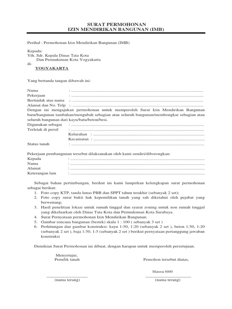 Kepala dinas tata kotadan permukiman kota surabayadi yang bertanda tangan dibawah ininama. Persyaratan untuk membuat surat izin mendirikan bangunan imb permohonan diatas kertas materai rp.