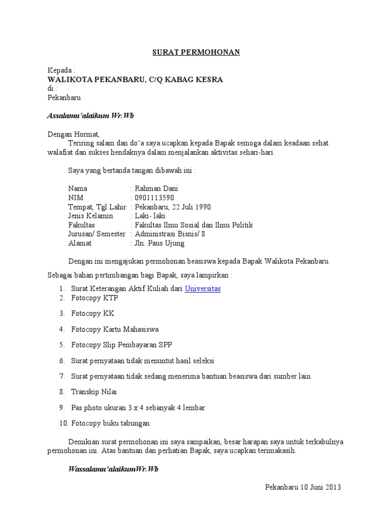 Contoh surat untuk walikota berupa permohonan yang baik sebagai manfaat bahan referensi yang baik untuk kita semua dalam menulis surat. Contoh surat permohonan dalam kehidupan sehari hari sering kali kita dihadapkan dengan suatu situasi yang tidak dapat dikerjakan dengan sendiri dan harus memerlukan bantuan pertolongan dari orang lainagar permohonan tersebut dikabulkan maka kita harus membuat sebuah surat permohonan yang ditujukan kepada pihak yang bersangkutan. Yang artinya kegiatan itu resmi diketahui kampus dan tidak liar. 3 contoh surat lamaran kerja di mcdonald profesional. Agar permohonan tersebut dikabulkan ada saatnya kamu akan meminta atau memohon bantuan kepada orang lain dan biasanya harus mengajukan surat permohonan. Surat permohonan berisi tentang sebuah permintaan tentang sesuatu hal kepada pihak yang bersangkutan perseorangan badan atau lembaga organisasi perusahaan atau instansi dan lainnya.