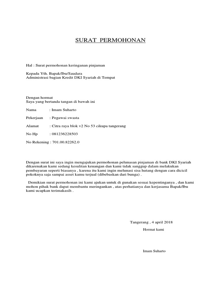 Contoh surat permohonan keringanan bunga bank. Nasabah tetap melakukan pembayaran cicilan pokok dan bunga sementara bank memberikan penurunan suku bunga sehingga. Admin dari blog seputar bunga 2019 juga mengumpulkan gambar gambar lainnya terkait contoh surat permohonan keringanan bunga bank dibawah ini. Bermaksud mengajukan permohonan keringanan atas kredit saya di bank samarinda permohonan keringanan ini terpaksa saya ajukan dikarenakan saya mengalami pailit dalam usaha yang saya jalankan dan saya sanggup melunasi kredit saya terebut sebesar rp. Jakarta 2014 kepada pt. Memohon agar bank mandiri menghapuskan bunga pinjaman. Pic di bank menyampaikan bahwa terdapat beberapa skema restrukturisasi yang ditawarkan oleh bank dan hal ini juga tercantum di surat permohonan restrukturisasi ke bank yaitu.