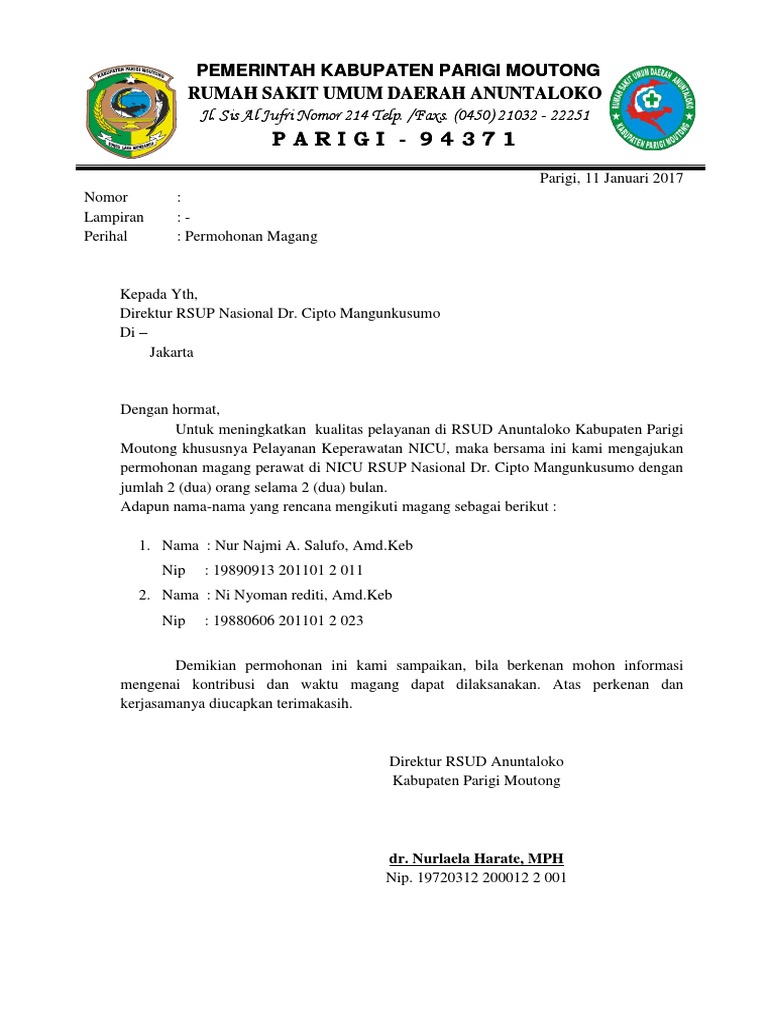 Anda pun bisa mengirimkan surat permohonan magang bidan seperti di bawah ini. Buat temen temen fresh graduation seperti saya semoga aja bermanfaat ya jng lupa perhatikan kerapihan tulisanyg di bawah ini masih perlu perbaikanhehe. Tidak bisa magang begitu saja anda pun harus mengajukan permohonan terlebih dahulu. Bagi anda yang menempuh pendidikan di bidang kebidanan tentu akan terbiasa kerja magang di suatu rumah sakit ataupun di suatu puskesmas dan beberapa lembaga kesehatan lainnya. Contoh surat lamaran magang kerja di rumah sakit ini tentunya kamu harus merubah ulang sesuai dengan keterangan yang kamu punya. Permohonan surat izin ini juga mneyertakan surat keterangan dokter yang mneyatakan harus melakukan rawat inap di rumah sakit.