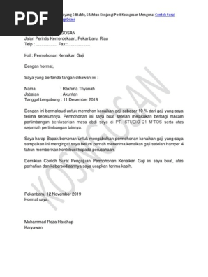Kepada yth pimpinan pt. Sebelum memutuskan untuk meminta kenaikan gaji kita harus mempunyai pertimbangan dasarnya terlebih dahulu agar permintaan kita dikabulkan oleh perusahaan jangan sampai kita belum lama bekerja baru sebulan atau dua bulan malah sudah ingin naik gaji. Pekerja yang berwibawa sedar tanggungjawab untuk melakukan yang terbaik bagi memastikan tugasnya terlaksana tanpa melanggar peraturan syarikat.