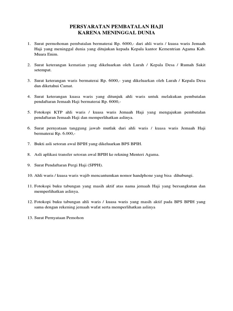 Surat permohonan pembatalan bermaterai rp6000 dengan menyebutkan alasan pembatalan yang ditujukan kepada kepala kantor kementerian agama kabupaten atau kota bukti asli setelah dp atau setoran awal dan setoran lunas bpih biaya penyelenggaraan ibadah haji yang dikeluarkan oleh bps bpih bank penerima setoran biaya penyelenggaraan ibadah haji. Contoh diatas merupakan surat pembatalan pengunduran diri haji karena meninggal. Dokumen yang diperlukan untuk mengajukan permohonan batal haji karena meninggal dunia antara lain tanda bukti setoran awal bpih asli surat pendaftaran pergi haji spph asli. Prosedur pembatalan daftar haji calon jemaah haji yang membatalkan pendaftarannya bpihnya dikembalikan melalui bps bpih tempat setor semula untuk setoran awal bpihnya di kembalikan penuh sedangkan untuk setoran lunas dikenakan biaya administrasi sebesaar 1 satu persen. Dalam contoh ini si pembuat merupakan ahli waris orang yang meninggal dunia. Anda bisa langsung menggunakan surat pengunduran haji tersebut dengan mengubah dan menyesuaikan beberapa data.