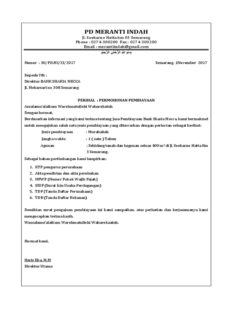 Contoh surat permohonan pembiayaan bank syariah. Contoh surat permohonan pembiayaan cv hajid jaya jl. Proposal permohonan kredit pembiayaan 18 pekanbaru 27 november 2013. 1 berkas dengan hormat. Jakarta 6 januari 2016. Proposal pengajuan kredit usaha. Mau nanya pakberkasku yang masuk di bank syariah.