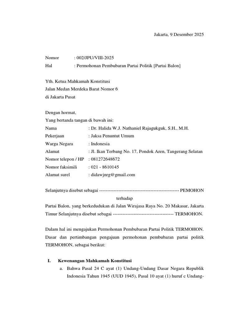 Contoh surat permohonan pembubaran partai politik. Pemohon uji materi bahwa ada syarat syarat tertentu yang harus dipenuhi pemerintah untuk mengajukan permohonan pembubaran partai kepada mk seperti yang diatur dalam pasal 40 dan 41 uu nomor 2 tahun 2011 tentang partai politik uu parpol. Pasal 24c ayat 1 uud 1945 menyatakan mahkamah konstitusi berwenang mengadili pada tingkat pertama dan terakhir yang putusannya bersifat final untuk menguji undang undang terhadap undang undang dasar memutus sengketa kewenangan lembaga negara yang kewenangannya diberikan oleh undang undang dasar memutus pembubaran partai politik dan memutus perselisihan tentang hasil pemilihan umum. Keinginan membubarkan berasal dari dalam partai sendiri. Hukum acara pembubaran partai politik partai politik. Pengertian partai politik 2. Partai politik parpol diatur dengan uu nomor 2 tahun 2008 jo uu nomor 2 tahun 2011.