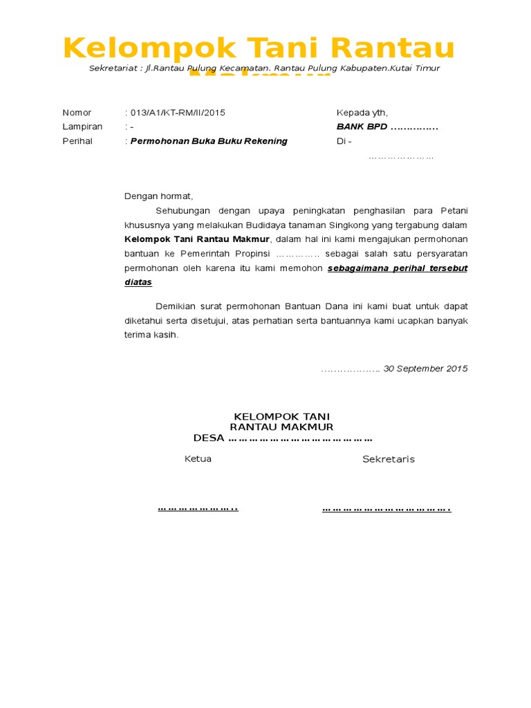 Kepala desa keputusan kepala desa no 1884 kep 2010 tentang kelompok bina keluarga balita bkb le. Notulen hasil rapat kelulusan. Untuk membuja rekening kelompok tani di bri diperlukan surat permohonan dari kepala desa. Kepada yth kabupaten suka damai. Uncategories contoh surat permohonan pembukaan rekening bank. Kop desa gampong.