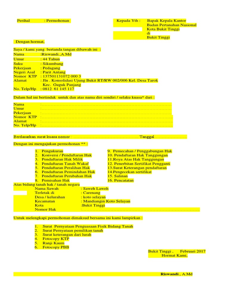 Memiliki sebidang tanah dengan luas 25 depak tangan x 200 depak tangan 17500 m2 yang terletak di jalan. Asli surat pernyataan fisik bidang tanah sporadik 3. Contoh surat pemblokiran ke bpn hal. Contoh permohonan pengukuran tanah dan pernyataan pemohon ikk. Itulah 7 contoh surat kuasa pengurusan tanah ke bpn kami berharap contoh surat yang kami sampaikan dapat membawa manfaat untuk anda dan bila dirasa anda masih kurang puas dengan contoh surat dari kami maka kami memohon maaf sebesar besarnya karena kami menyadari bahwa blog ini masih jauh dari kata sempurna untuk itu kami mohon masukan dan saran dari anda demi kemajuan blog ini. Asli surat jual beli tanahtanggal 10 maret 1976.