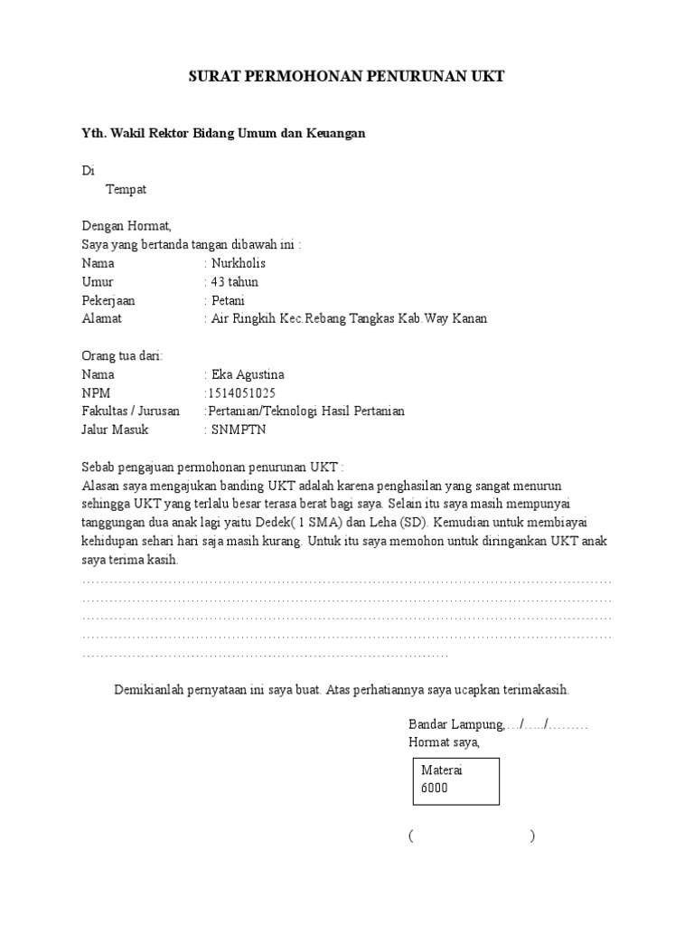 Contoh surat permohonan keringanan biaya kuliah sebagai referensi dalam membuat surat permohonan keringanan biaya yang baik. Eka agustina npm 1514051025 fakultas jurusan pertanianteknologi hasil pertanian jalur masuk. Air ringkih kecrebang tangkas kabway kanan orang tua dari. Hal itu dikarenakan publisitas kegiatan akan sangat baik jika ada media partnersemakin besar media yang menjadi media partner bagi kegiatan semakin megah pula kegiatan tersebut. Contoh surat permohonan ukt. Academiaedu is a platform for academics to share research papers.