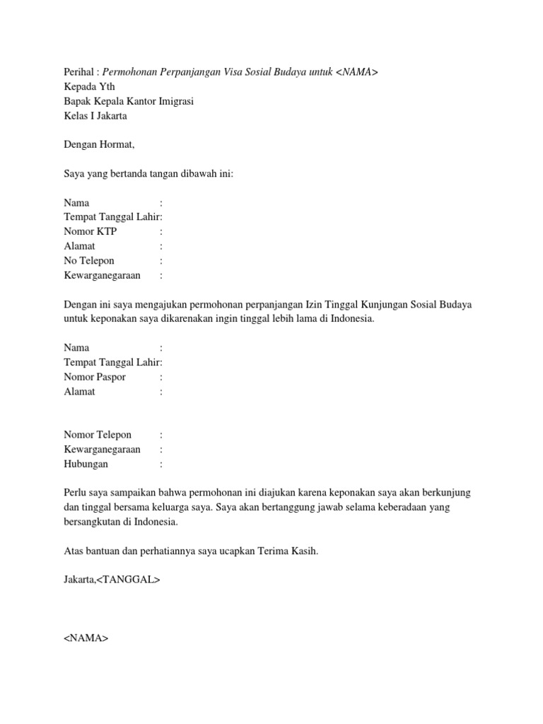 Bapak kepala kantor imigrasi klas i indonesian citys name di citys name. Fb twitter wa line pinterest g linkedin. Permohonan visa kunjungan untuk namerelationship or. Softgaleri adalah blog yang berbagi informasi kode administrasi dalam surat menyurat administrasi aplikasi dan administrasi guru yang mana file berikut ini adalah kumpulan dari berbagi sumber tentang surat izin suami untuk permohonan visa jepang yang bisa bapakibu gunakan dan diunduh secara gratis dengan menekan tombol download. Admin blog berbagi contoh surat 2019 juga mengumpulkan gambar gambar lainnya terkait contoh surat permohonan visa sosial budaya dibawah ini. Sample sosbudvoa visa extension letter place date perihal.