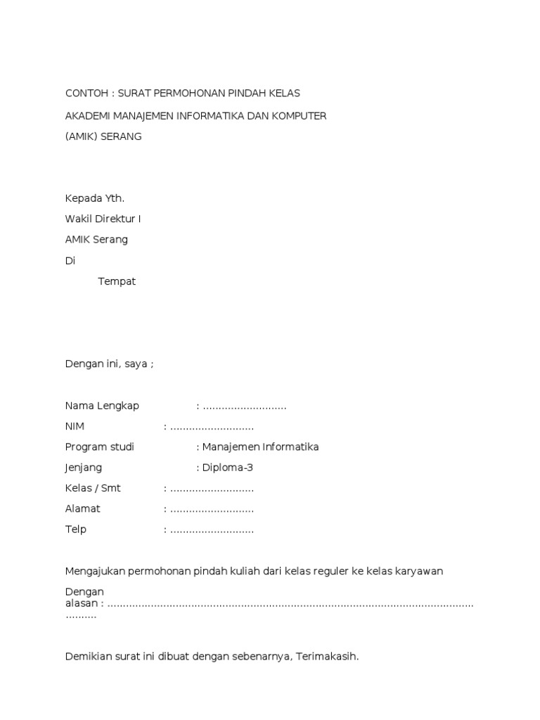 Mengajukan permohonan untuk pindah dari kelas reguler ke kelas karyawanpermohonan ini saya ajukan karena saya kerja jam kerja 0730 1700. Ketika saya konsul dengan ketua jurusan saya beliau mengatakan jika ingin pindah kelas menjadi kelas karyawan harus mengajukan surat pe. Contoh surat pindah sekolah paud format doc sekolah kepala. Menjelang tahun ajaran baru pasti banyak yang ingin melakukan pindah kuliah karena itu saya berikan contoh surat permohonan pindah kuliah sbb. Nah itulah diatas keempat contoh surat permohonan pindah tugas yang sempat saya bagikan kali ini semoga dapat membantu teman teman yang sedang mencari contoh surat permohonan pindah tugas ini. Surat permohonan pindah kuliah surat lamaran kerja adalah surat yang digunakan untuk melakukan permohonan mendapatkan pekerjaan sesuai pengalaman pada perusahaan tertentu.