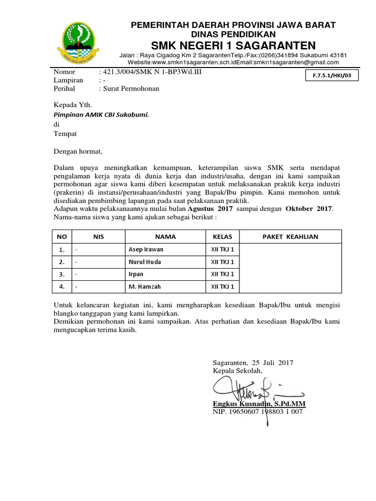 Contoh surat permohonan magang kerja sudah tidak asing dengan surat permohonan magang kerja kan. Surat pengantar pkl mahasiswa. Contoh surat izin pkl smk. Download contoh surat permohonan praktek kerja industri pkl jenjang smk march 15 2018 contoh surat surat permohonan prakerin doccontoh surat izin pkl smk. Surat pengantar prakerin docsurat prakerin kerjacontoh surat izin tidak masuk prakerincontoh surat permohonan pindah pklsurat permohonan pindah prakerin. Contoh surat permohonan praktek kerja lapangan pkl smk praktek kerja lapangan untuk seorang siswa smk adalah bukan suatu hal yang asing.