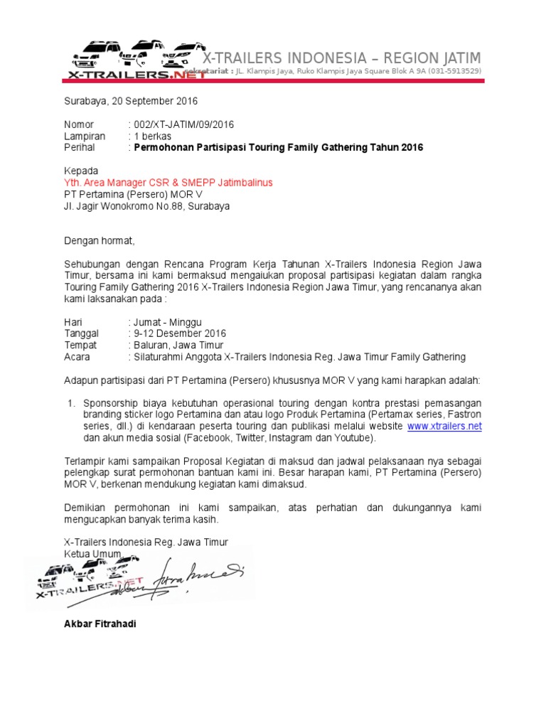Surat family gathering merupakan salah satu contoh dari surat pemberitahuan yang digunakan oleh perusahaan lembaga atau instansi untuk memberikan informasi terkait kegiatan family gathering pertemuan antar keluarga kepada seluruh karyawanpegawai tempat tersebut. Meningkatnya jumlah penduduk yang meningkat setiap tahun tak ayal menjadi salah satu alasan mengapa persaingan menempati posisi tertentu tidak semudah membalikkan telapak tangan. Surat pemberitahuan ini bisa bersifat umum dengan ditujukan langsung ke beberapa orang dengan ditempelkan di papan pengumuman di. Contoh surat permohonan sponsor sebagai referensi membuat surat permohonan sponsor resmi yang meyakinkan dan profesional. Panitia acara hut republik indonesia kompleks tangerang indah vi tangerang selatan. Ini adalah beberapa contoh surat permohonan baik itu permohonan dana bantuan ke perusahaan permohonan izin kerjasama rekomendasi maaf permohonan cuti dan lain sebagainya.