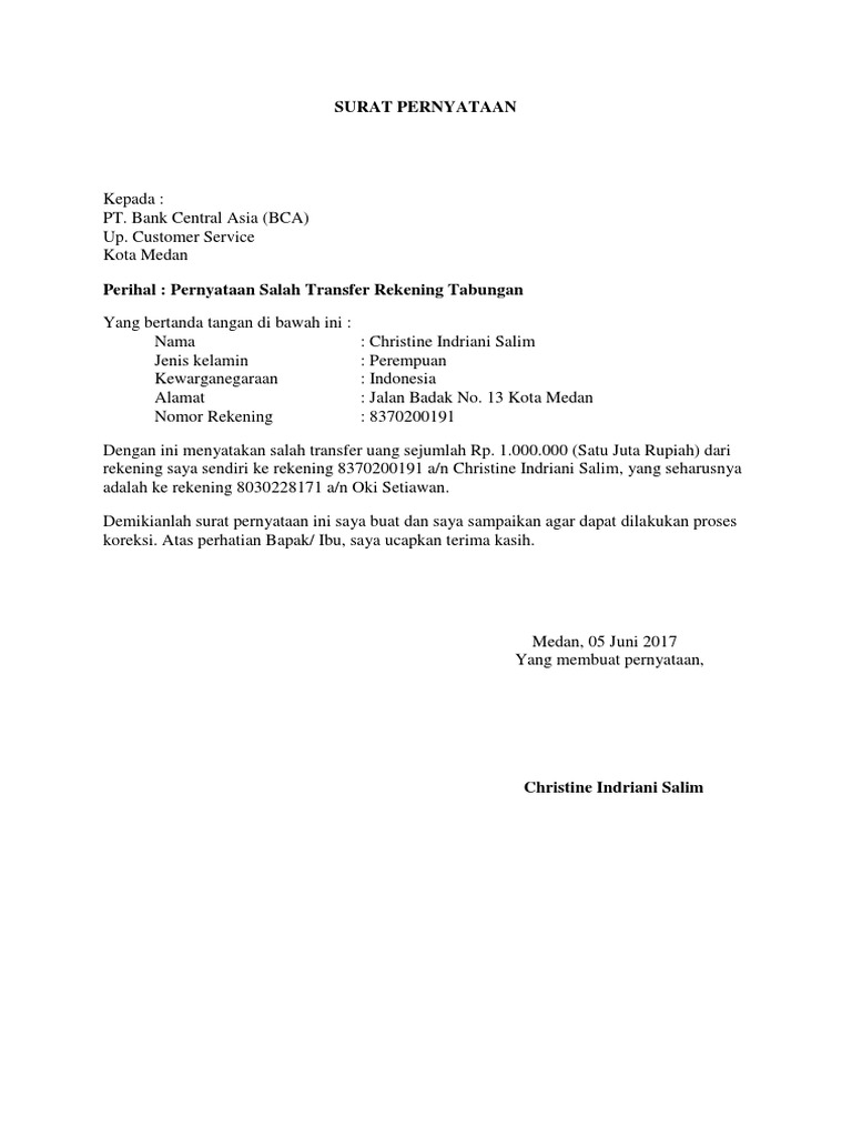 Contoh permohonan pengembalian uang no. Contoh surat pernyataan salah transfer uang yang baik sebagai bahan referensi dalam membuat surat pernyataan dengan format resmi. Tempattanggal lahir. Dalam hal ini bertindak dalam jabatannya tersebut dari dan karenanya sah dan berwenang untuk mewakili pt. Surat permohonan adalah surat yang berisi permintaan atau permohonan secara resmi kepada seseorang badan instansi atau perusahaan. Contoh surat pernyataan kelebihan transfer dana ke rekening perusahaan.