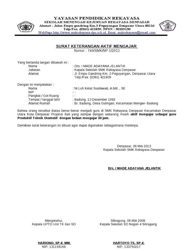Contoh surat keterangan aktif mengajar surat keterangan aktif mengajar adalah sebuah surat yang dikeluarkan oleh sekolah dan ditandatangani oleh kepala sekolah yang menerangkan seseorang guru tersebut masih aktif mengajar di sekolah tersebut. Surat keterangan aktif mengajar guru paud yayasan islam al ianah paud innara purnama jalan pb sudirman no. Untuk lebih jelasnya anda bisa melihat contoh surat pernyataan kepala sekolah untuk guru sertifikasi di bawah ini. Surat ini dibuat dengan tujuan agar orang tua wali mengetahui kegiatan yang dilaksanakan. Contoh surat aktif mengajar surat keterangan aktif mengajar tk contoh fo. 89 bandung jawa barat indonesia.