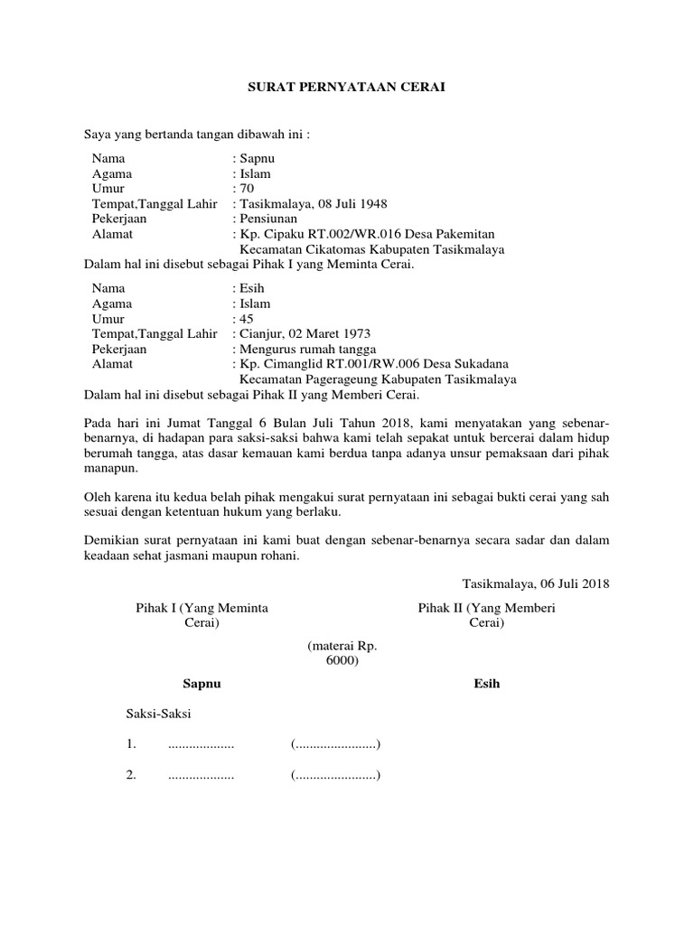 Academiaedu is a platform for academics to share research papers. Ada banyak alasan yang mengharuskan sepasang suami istri untuk bercerai dan berpisah tergantung dari permasalahan keluarga masing masing. Nama surat seperti pada surat pernyataan lain pada umumnya hal pertama yang harus dicantumkan adalah nama surat itu sendiri. Surat pernyataan cerai merupakan sebuah surat pernyataan yang dibuat oleh pasangan suami istri yang berisi tentang pernyataan bahwa kedua belah pihak suami dan istri telah sepakat untuk memutuskan berpisah atau bercerai. Contoh surat pernyataan cerai pada umumnya tidak ada orang yang menginginkan perceraian namun pada kenyatannya masih sering terjadi kasus perceraian dimana mana. Mbamau tanya apakah surat perjanjian perceraian ini dpt dipatahkan atau dibatalkan pd saat sidang cerai nanti walaupun sdh di ttdtgn d atas materai dan ada saksi2nyacontohnyamisal dlm surat perjanjian itu kami sdh sepakat bhwa pengasuhan anak ada di saya ibunyatp tiba2 dlm persidangan tnyata suami menuntut hak asuh anaknah apakah surat perjanjian itu bs saya jadikan senjata dipersidangan.