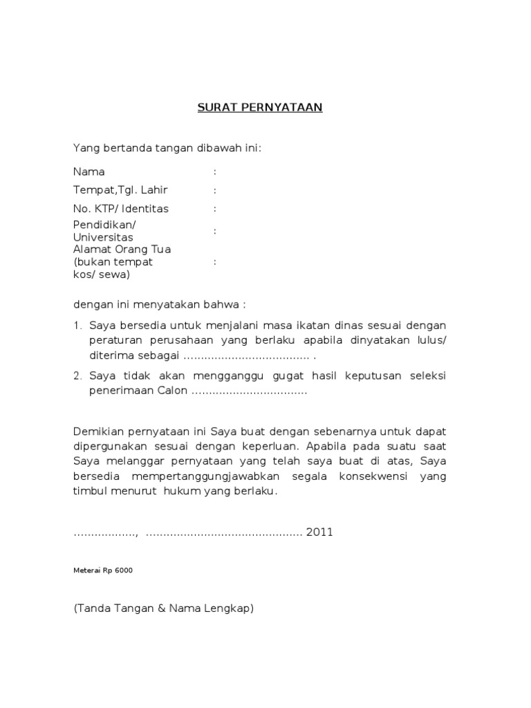 Tujuan manfaat dari surat pernyataan adalah sebagai penjamin kepastian hokum. 35000000 tiga puluh lima juta rupiah. Dengan ini menyatakan dengan sesungguhnya bahwa saya bersedia menjalani ikatan dinas sampai dengan 10 sepuluh tahun serta menyerahkan ijazah asli pendidikan terakhir. Surat pernyataan biasanya dibuat oleh orang yang ingin menerangkan sesuatu agar bisa dipercaya oleh penerima surat. Biasanya surat ini dilengkapi dengan materai sebagai penguat kepercayaan dan agar terlihat kredibel. Seperti yang diketahui bahwa sekolah ikatan dinas ini merupakan sekolah yang terikat oleh pemerintah.