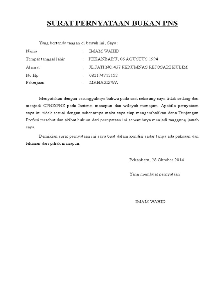 Contoh surat pernyataan bukan pns. Tirto id pendaftaran cpns 2019 kemendikbud formasi lulusan sma yang telah dibuka pada 13 27 november 2019 mewajibkan pelamar mengunggah dokumen surat lamaran dan pernyataan ke portal sscasn bkn. Ada juga untuk contoh form surat pernyataan cpns 2018 terbaru. Contoh surat pernyataan pendaftaran cpns contoh format surat lamaran dan surat pernyataan cpns 2018. Nah bagi anda yang sedang membutuhkan referensi tentang bagaiman cara membuat surat pernyataan cpns berikut ini kami sediakan contoh surat pernyataan cpns untuk lulusan sma di salah satu kementerian yang kebetulan di tahun 2018 ini sedang membuka pendaftaran cpns. Contoh surat pernyataan cpns bkn dibaca normal 2 menit. Arsip nasional republik indonesia badan ekonomi kreatif badan informasi geospasial badan intelijen negara badan keamanan laut ri badan kepegawaian negara badan kependudukan dan kb nasional badan koordinasi penanaman modal.