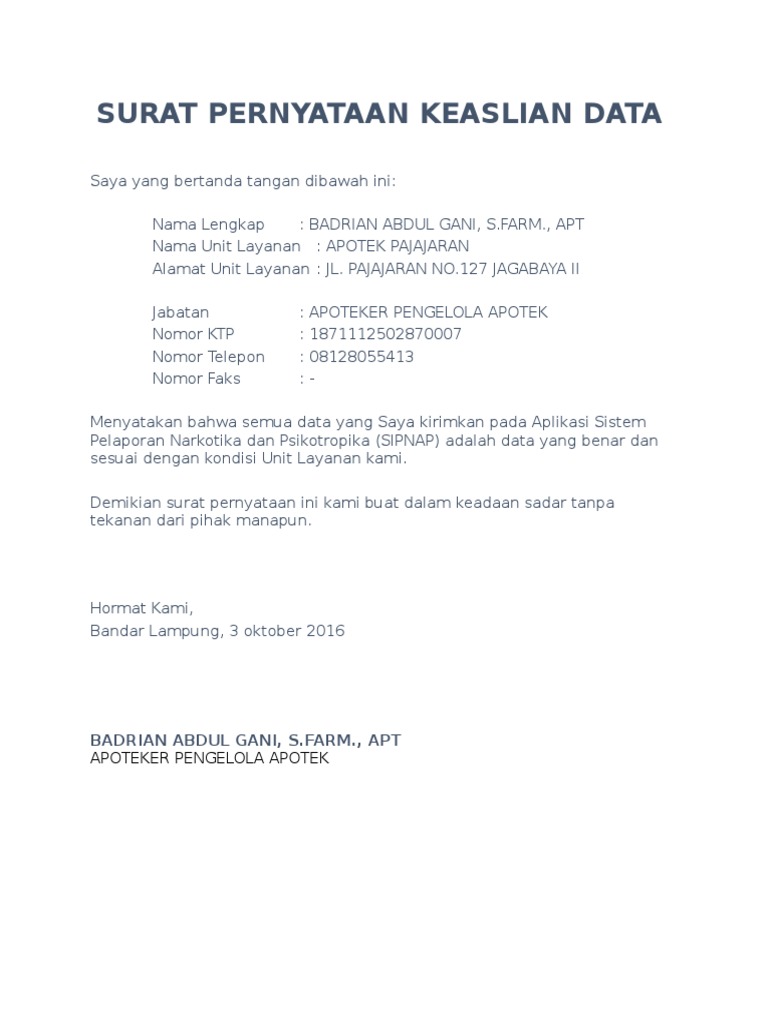 Contoh surat pernyataan keaslian data. Menyatakan bahwa semua data yang di unggah ke portal rekomendasi ekspor impor produk pertanian tertentu reippt online adalah asli dan benar. Hormat kami jakarta 1 januari 2014 materai rp6000 nama lengkap jabatan. Senin 28 desember 2015 surat pernyataan kebenaran data yang bertanda tangan di bawah ini. Dengan sungguh sungguh menyatakan bahwa. Kop perusahaan surat pernyataan keabsahan dan kebenaran dokumen yang bertanda tangan dibawah ini. Home contoh surat pemerintahan surat dinas surat pernyataan kebenaran data.