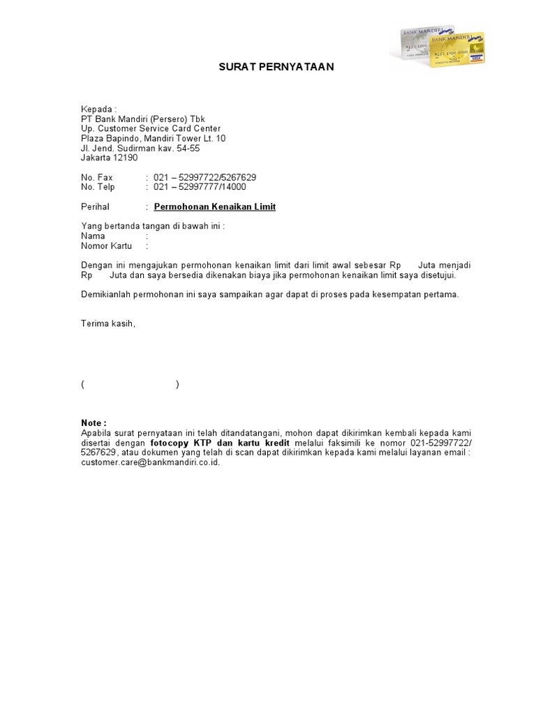 Surat pernyataan kenaikan limit doc. 142pbi2012 dan surat edaran bank indonesia no. Contoh surat pernyataan kenaikan limit kartu kredit. Apabila surat pernyataan ini telah ditandatangani mohon dapat dikirimkan kembali kepada kami dalam format pdf tidak melebihi 2 mb disertai dengan foto copy ktp foto copy kartu mandiri foto copy slip gaji dan foto copy npwp melalui faksimili ke nomor 021 5267370 52997722 atau dapat mengirimkan. 7000000 tujuh juta rupiah karena saat ini bila membeli barang tidak mencukupi. Berikut adalah contoh surat pernyataan pengajuan limit kartu kredit bni.
