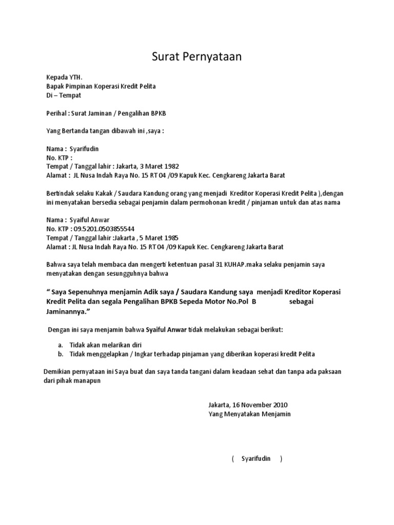 Jika anda ingin membuat surat pernyataan untuk suatu keperluan maka anda perlu tahu format yang benar dalam membuatnya. Contoh surat pernyataan orang tua 4 contoh surat pernyataan orang tua wali murid berikut adalah contoh surat pernyataan orang tua murid atau wali yang bisa dipergunakan untuk siswa siswi sd smp sma atau mahasiswa yg sedang kuliah. Demikian contoh surat jaminan perusahaan yang baik dan benar sebagai referensi anda dalam membuat surat resmi yang profesional. Kalau masih bingung anda bisa menyimak contoh surat pernyataan dengan berbagai kepentingan berikut ini. 15 contoh surat pernyataan paling lengkap untuk berbagai kebutuhan belakangan ini penggunaan surat memang bisa dibilang sudah semakin minim terlebih untuk urusan pribadi. Hal ihwal keberadaan serta kegiatan orang asing yang bersangkutan selama berada di indonesia.