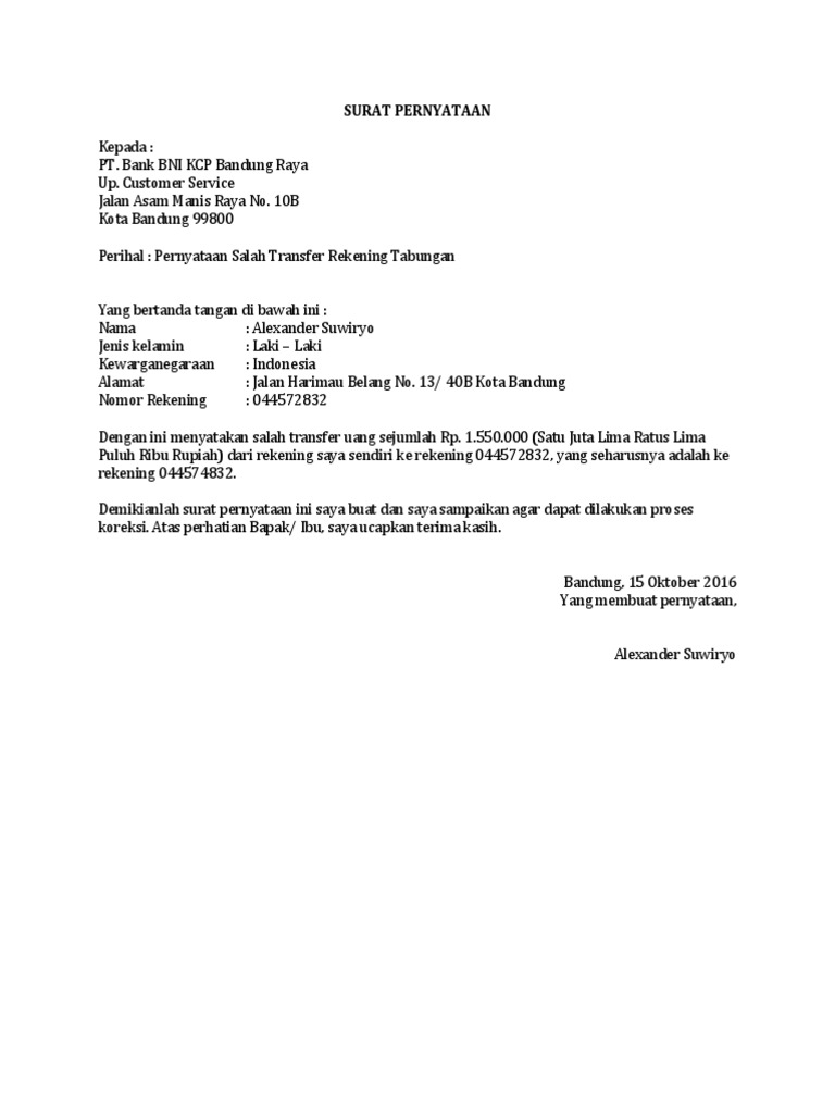 Contoh surat pernyataan salah transfer. Contoh surat pernyataan salah transfer uang bank perusahaan dan pribadi reviewed by raymond on wednesday january 24th 2018. This is article about contoh surat pernyataan salah transfer uang bank perusahaan dan pribadi with description. Surat pernyataan yang menyangkut aspek hukum harus di tulis di atas kertas segel atau kertas biasa yang di bubuhi materai. Surat pernyataan yang bertanda tangan di bawah ini. Contoh surat pernyataan salah transfer uang pribadi mudahnya melakukan transfer uang sesama bank dan antar bank memang banyak membantu kita dalam bertransaksi. Namun bukan tidak mungkin terdapat kesalahan sewaktu melakukan transfer uang dan malah mentransfer uang ke nomor rekening yang tidak seharusnya.