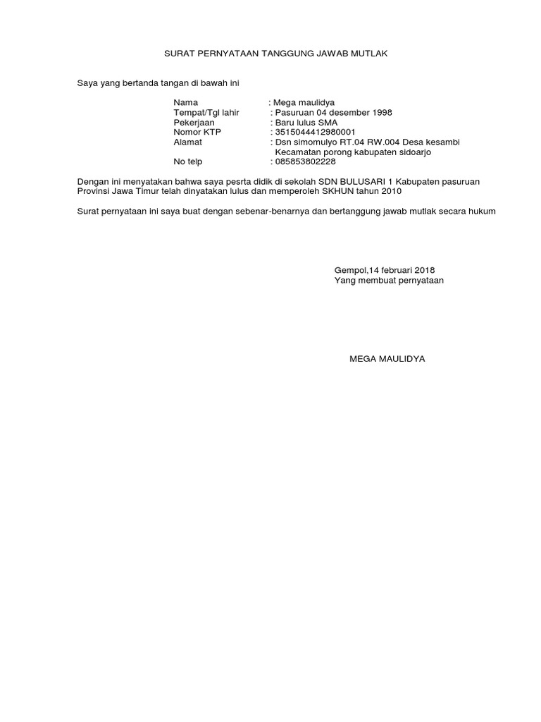 Tidak jarang surat pernyataan tanggung jawab mutlak yang isinya kurang mudah dipahami sehingga menimbulkan konflik di kemudian hari. Demikian surat pernyataan tanggung jawab mutlak ini saya buat untuk dapat digunakan sebagaimana mestinya. Nama lengkap orang tuawali. Demikian surat pernyataan ini saya buat dalam keadaan sadar tanpa paksaan dan bermaterai 6000 form. Contoh surat perjanjian kerja sama usaha untuk bagian akhir anda bisa membuat penutup seperti penutup surat yang lain pada umumnya. Permendikbud nomor 51 tahun 2018 juknis ppdb.