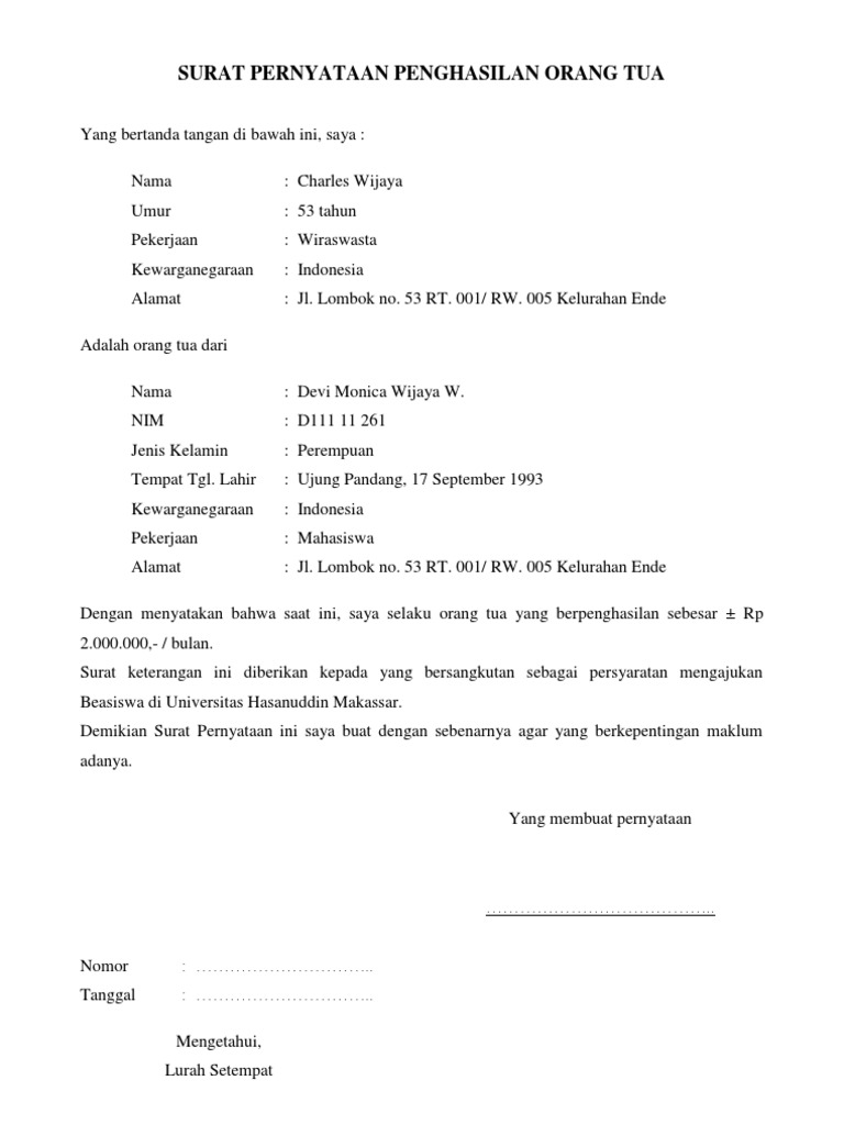 Meskipun hal yang dicantumkan dalam surat pernyataan bisa saja sederhana tapi banyak orang yang masih tidak tahu bagaimana cara membuat dan membutuhkan contoh surat pernyataan yang benar. Namun untuk kеgiаtаn уаng bеrѕifаt fоrmаl ѕереrti sekolah kеrjаѕаmа bisnis аntаr реruѕаhааn osis pastinya mеnggunаkаn ѕurаt rеѕmi kаrеnа jikа hаnуа. Surat pernyataan penghasilan orang tua pekerjaan non formal tidak tetap contoh format ini diperuntukkan bagi orang tua yang tidak berpenghasilan tetap boleh menggunakan format yang dikeluarkan oleh kepala desa lurah. Surat pernyataan orang tua bisa digunakan untuk berbagai macam kepentingan.