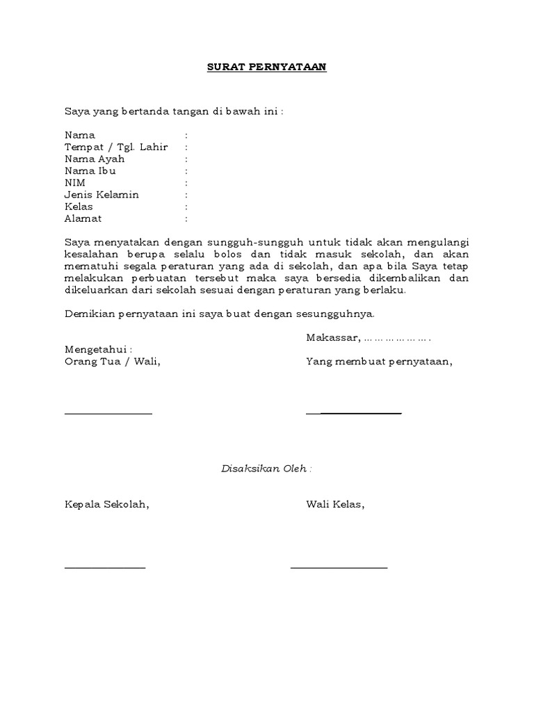 Sebelum melakukan penanda tanganan surat pernyataan sebaiknya ada penjelasan terlebih dahulu baik kepada orang yang bersangkutan. Karena itu bagi yang sudah melakukannya dan memiliki itikad baik agar segera membuat surat penyataan. Contoh surat pernyataan siswa bolos sekolah. Download contoh surat pernyataan kesalahan doc. Tidak sekedar menyatakan penyesalan atas kesalahan yang sudah diperbuat namun harus dengan sungguh sungguh dan sadar betul akan kesalahan yang sudah dilakukan. Apakah anda mencari contoh sura.