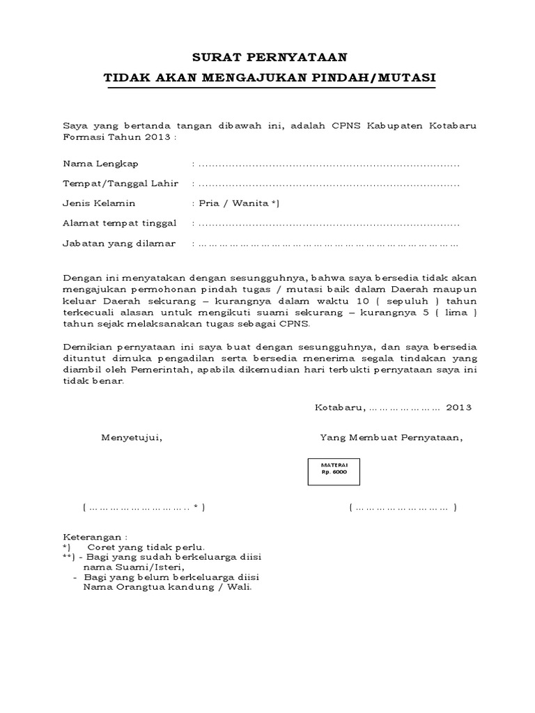 Contoh surat pernyataan tidak mengajukan pindah. Oleh karena itu saya mencoba membuat sebuah contoh surat untuk bahan referensi anda membuat surat pernyataan yang baik dan benar. Lingkungan pemerintah provinsi riau maka saya bersedia mengabdi dan tidak mengajukan permohonan pindah ke pemerintah provinsikabkota lain selama 10. Surat pernyataan tidak akan mengajukan pindah. Download formulir permohonan kk. Contoh surat lamaran cpns 2019 baru kata kunci. Contoh surat permohonan mutasi pindah tugas pns.