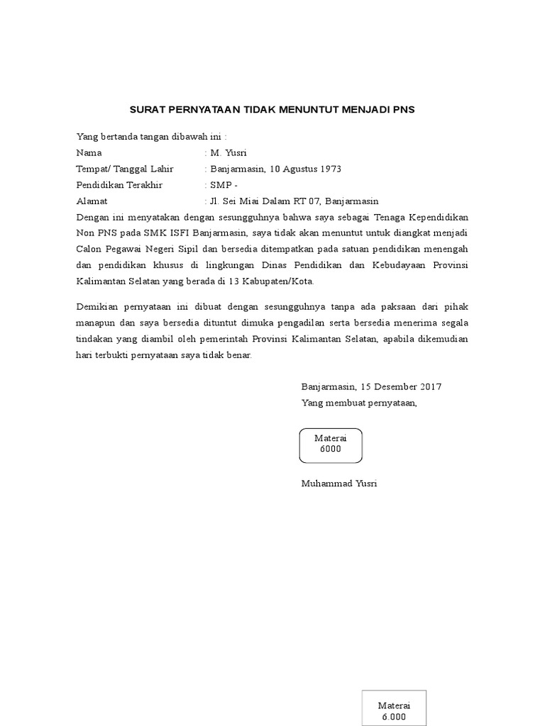 Membuat surat pernyataan dalam melamar cpns bagi yang belum pernah memang sedikit susah. Contoh surat pernyataan cpns 2017 resmi menpan lulusan sma smk d3 d4 s1 s2 semua jurusan bank bumn cpns 2018 daerah provinsi kementerian cpns 2018. Contoh surat pernyataan tidak menuntut pns adalah gambar contoh surat berdefinisi tinggi dan memiliki ukuran 1236x1600. Menyatakan dengan sesungguhnya bahwa saya betul betul berstatus guru non pns dan tidak berstatus sebagai cpnspns. Contoh surat pernyataan tidak menuntut. Dimana surat pernyataan untuk calon pegawai negeri sipil memang berguna untuk menyatakan bahwa anda tidak pernah dipecat pendidikan sesuai kesehatan baik dan juga tidak pernah melakukan.