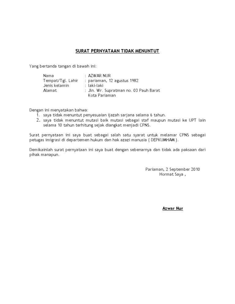 Demikian surat pernyataan ini saya buat dan apabila dikemudian hari pernyataan saya ini tidak benar saya bersedia mengembalikan ke kas negara atau menerima sanksi lainnya sesuai dengan ketentuan yang berlaku. Selain dalam hal transaksi surat pernyataan juga diperlukan dalam masalah pekerjaan salah satunya adalah pengajuan cpns. Surat pernyataan tidak menuntut penyetaraan pangkat dan golongan 9. Surat pernyataan ini saya buat sebagai salah satu syarat untuk melamar cpns sebagaipetugas imigrasi di departemen hukum dan hak azazi manusia depkumham. Surat ini biasanya dibuat oleh guru honor atau guru bantu yang sedang mengikuti pendidikan lebih tinggi sedangkan dia juga mengajar sebagai guru di suatu sekolah. 2saya tidak menuntut mutasi baik mutasi sebagai staf maupun mutasi ke upt lainselama 10 tahun terhitung sejak diangkat menjadi cpns.