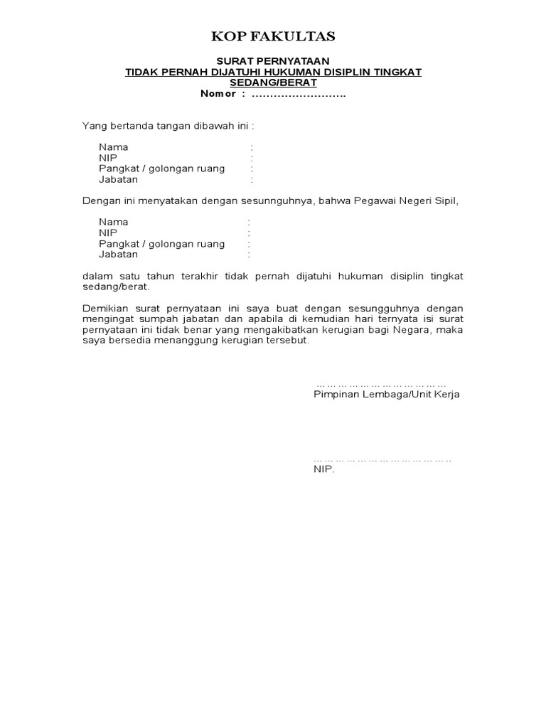 Contoh surat pernyataan tidak pernah dijatuhi hukuman disiplin. Galeri suratberbagi aneka contoh surat formal dan nonformal contoh surat keterangan tidak sedang dijatuhi hukuman disiplin untuk selengkapnya silahkan klik link di atas. Contoh surat pernyataan tidak pernah dihukum penjara untuk cpns 2019 contoh surat pernyataan tidak berkedudukan sebagai cpns pns surat pernyataan tidak pernah. Demikian surat pernyataan ini saya buat dengan sesungguhnya dengan mengingat sumpah dan apabila dikemudian hari ternyata isi surat pernyataan ini tidak benar yang mengakibatkan kerugian negara maka saya bersedia menanggung kerugian tersebut. Berikut saya contohkan setelah akhir tulisan dibawah ini. Surat pernyataan tidak pernah dijatuhi hukuman disiplin demikianlah pembahasan yang dapat kami sampaikan mengenai surat tidak pernah dijatuhi hukuman disiplin pns. Untuk contoh surat tersebut akan saya tulis pada postingan selanjutnya.