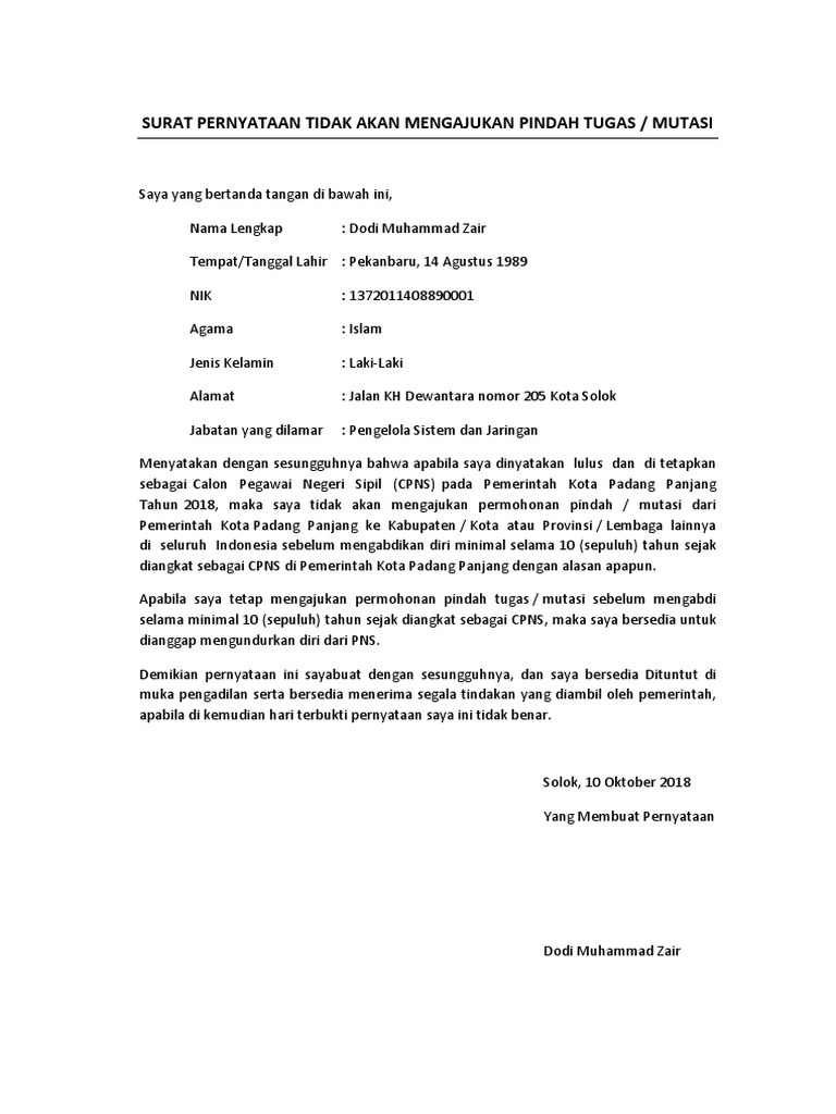 Surat pernyataan pimpinan perangkat daerah tentang tidak pernah dijatuhi hukuman disiplin tingkat sedang atau berat. Contoh surat lamaran cpns 2019 baru kata kunci. Penutup surat pernyataan yang terdiri dari. Ini dia contoh surat pernyataan persetujuan untuk pns pindah bertugas di daerah yang lain. Namun pada beberapa kasus anda pun bisa mengajukan permohonan pindah tugas terutama untuk pns.