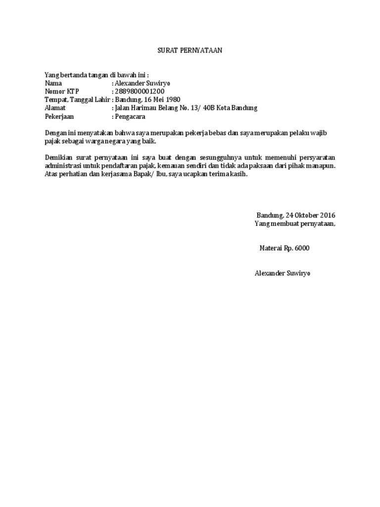 Contoh surat pernyataan untuk membuat npwp. Dan fotokopi dokumen izin kegiatan usaha yang diterbitkan oleh instansi yang berwenang atau surat keterangan tempat kegiatan usaha atau pek. Semakin baik anda membuatnya maka juga akan semakin bagus bukan hanya itu ada juga surat pernyataan yang dibuat sebagai kewajiban dan anda harus membuat itu. Itulah beberapa contoh surat pernyataan yang bisa anda buat untuk kelengkapan berkas anda. Demikian contoh surat pernyataan npwp yang dibutuhkan untuk melengkapi syarat pembukaan nomor rekening di bank bri syariah dan salinan isi tulisannya. Terimakasih sudah membaca artikel contoh surat kuasa pengambilan npwp nomor pokok wajib pajak semoga bermamfaat bagi para pembaca. Contoh surat keterangan kerja untuk pembuatan npwp doc oleh ri van diposting pada 13 november 2018 13 november 2018 di dalam bekerja pada suatu perusahaan tentunya jika sudah menyandang gelar sebagai karyawan tetap pastinya untuk pendapatan gaji yang di dapat tidaklah sedikit atau bahkan.