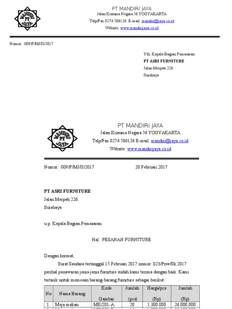 Contoh surat pesanan barang furniture. Surat penawaran furniture pt. Terutama jika terjadi salah pengiriman barang. Kepala surat atau kita kenal dengan kop surat memuat informasi mengenai nama kantor logo identitas alamat kantor nomor telepon email fax pengirim surat. Selamat datang kembali di situs kami para pembaca sekalian. Surat pesanan barang ini termasuk ke dalam surat resmi dan seringkali dipergunakan oleh setiap.