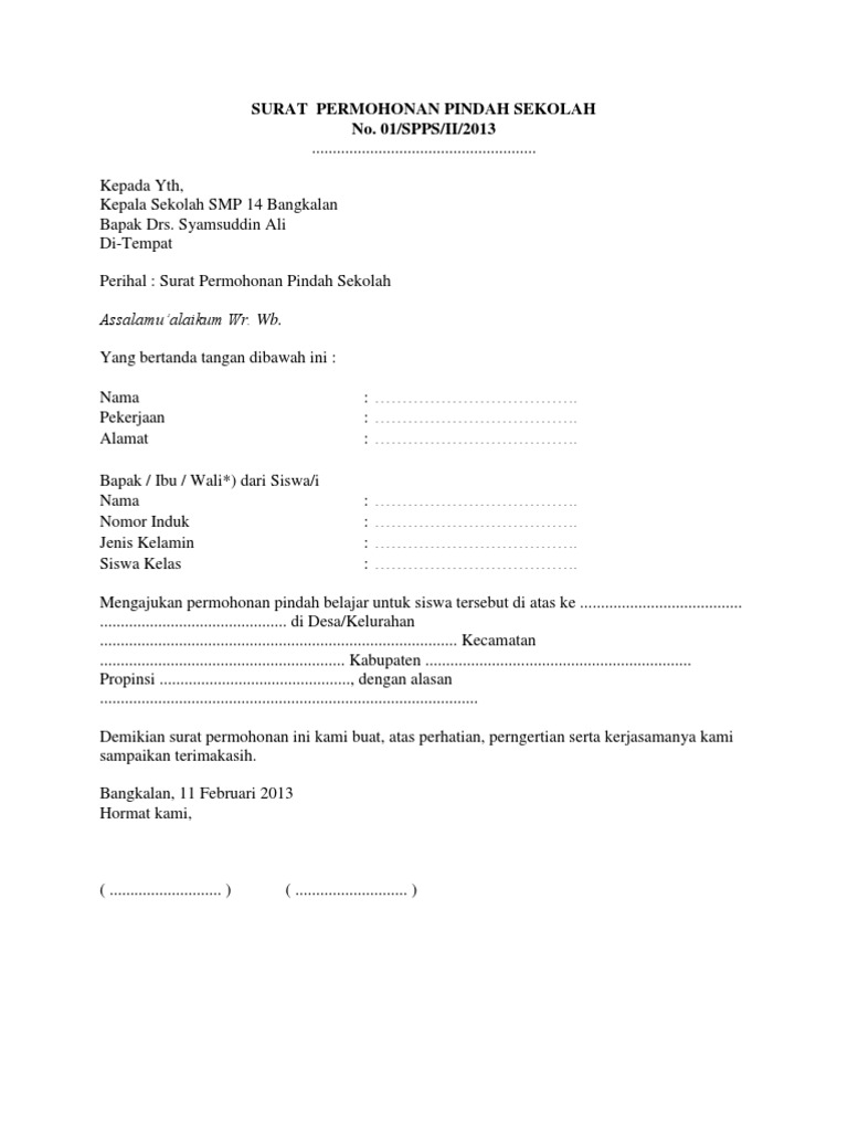 Contoh surat pindah sekolah smp. Sekolah adalah hal yang sangat penting untuk setiap orang. Maka dari itulah orang tua selalu memperhatikan penuh dari sekolah di tempat anak mereka belajar. Surat ini memang memuat data yang sangat lengkap tetapi beberapa memang sebenarnya tidak terlalu diperlukan dan bisa dicek di dokumen lain seperti buku rapor. Anda tinggal mengedit bagian tertentu untuk selanjutnya bisa digunakan secara resmi. Untuk itu anda pun bisa download contoh surat permohonan pindah sekolah dari orang tua murid doc di bawah ini. Seperti contoh surat rekomendasi pindah sekolah antar provinsi syarat pindah sekolah antar kabupaten cara pindah sekolah dari smp ke mts cara pindah sekolah dari swasta ke negeri contoh alasan pindah sekolah contoh surat permohonan masuk sekolah hingga prosedur mutasi siswa ada di sini.