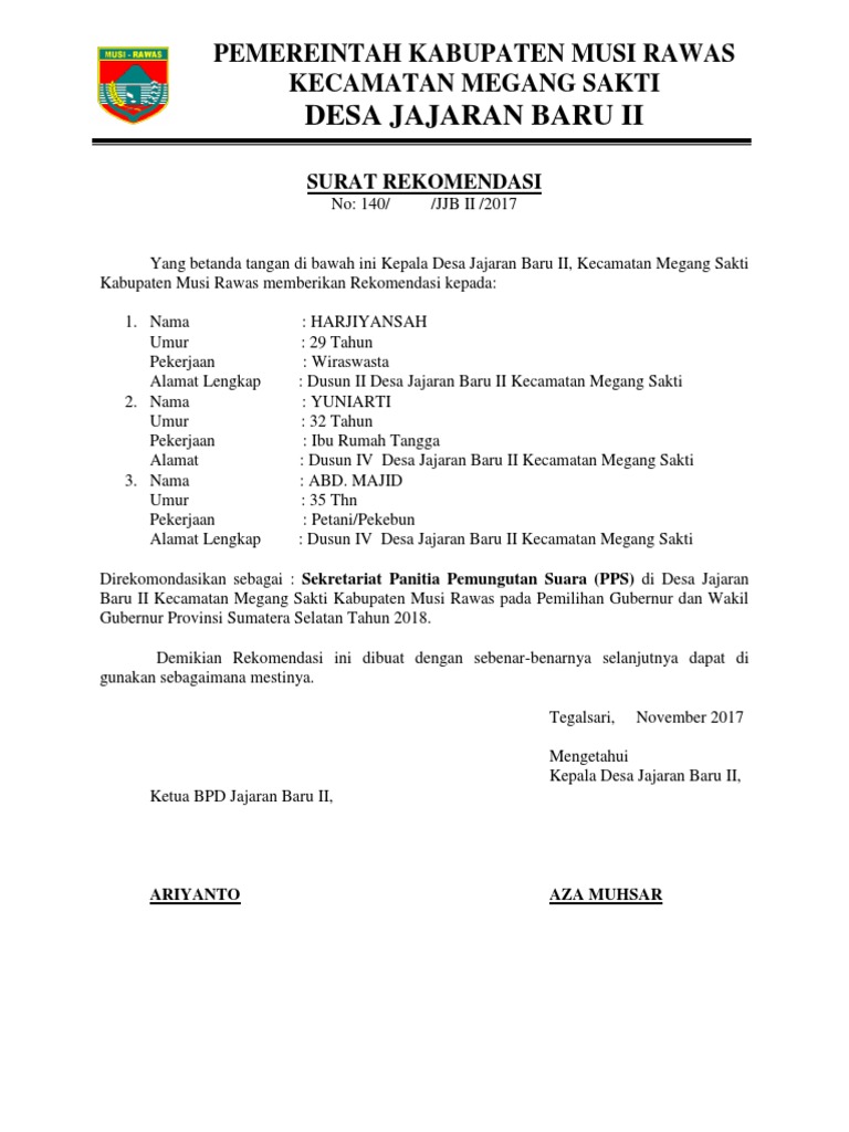 Contoh surat rekomendasi kepala desa beberapa bulan terakhir ini banyak sekali masyarakat semende yang mengajukan lamaran untuk bekerja di supreme energy rantau dedap salah satunya adalah untuk bekerja di pt. Dari kabar yang saya terima juga dengan adanya surat rekomendasi dari kepala desa akan mempermudah diterimanya bekerja di perusahaan. Maka dari itu anda bisa memberikan surat permohonan rekomendasi seperti di bawah ini kepada aparat desa. Jadi surat adalah alat komunikasi tertulis yang disampaikan dari satu pihak kepada pihak lain. Atas dasar rekomendasi inilah sehingga kepala desa menetapkan sk surat keputusan tentang pemberhentian dan pengangkatan perangkat desa. Saat berkomunikasi dalam keseharian kita saling memberikan informasi antara satu dengan.