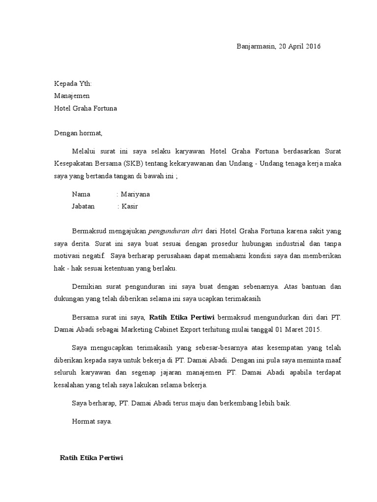 Contoh dan format surat pengunduran diri resign sebelumnya saya sudah menjelaskan mengenai surat lamaran kerja yang baik dan benarnah pada kesempatan kali ini saya akan menjelaskan mengenai surat pengunduran diri atau biasa dikenal dengan resign dari pekerjaan. Kepada yth hrd manager. Terkadang ada banyak hal disaat kita bekerja di sebuah perusahaan atau instansi yang membuat kita merasa tidak nyaman bekerja lagi. Kulon progo 28 september 2017. 12 pengasih kulon progo. Contoh surat pengunduran diri kerja.