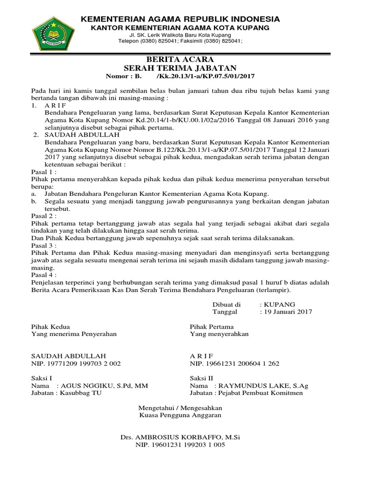 Contoh berita acara serah terima uang kas tunai dari bendahara contoh struktur kepemudaan gampong desa. Surat serah terima adalah surat yang menyatakan tentang serah terima satu barang atau dokumen bahkan juga kadang kadang dipakai saat berlangsung hand over satu pekerjaan lantaran pergantian jabatan. Contoh berita a car a serah terima jabatan bendahara contoh berita a car a serah terima jabatan pengurus osis contoh berita a car a serah terima jabatan ketua pkk. Contoh surat perjanjian pinjam pakai sebidang tanah pada hari ini senin tanggal tujuh b ulan april t ahun dua ribu empat belas. Tanggal yang selanjutnya disebut sebagai pihak kedua mengadakan serah terima jabatan dengan ketentuan sebagai berikut. Surat serah terima adalah surat yang menyatakan tentang serah terima satu barang atau dokumen bahkan juga kadang kadang dipakai saat berlangsung hand over satu pekerjaan lantaran pergantian jabatan.