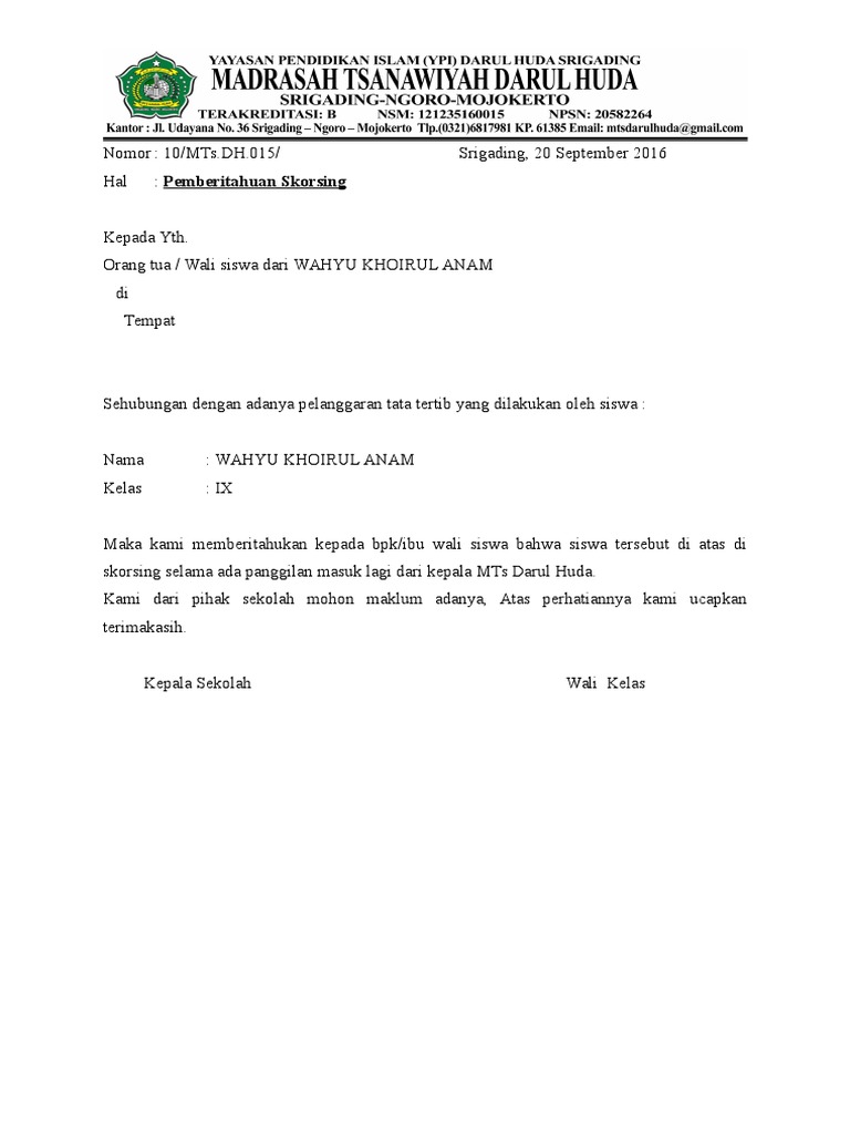 Contoh soal uas. Dinas pendidikan pemuda dan olahraha. Kami dari pihak sekolah mohon maklum adanya dan meminta maaf yang sebesar besarnya. Maka kami memberitahukan kepada bpkibu wali siswa dari sapiah juleha bahwa siswa tersebut di atas di skorsing selama satu minggu dari tanggal 14 sampai dengan tanggal 21 februari 2017. Contoh surat skorsing siswa contoh surat skorsing siswa. Contoh sk penerimaan peserta didik baru ppdb contoh profil sekolah.