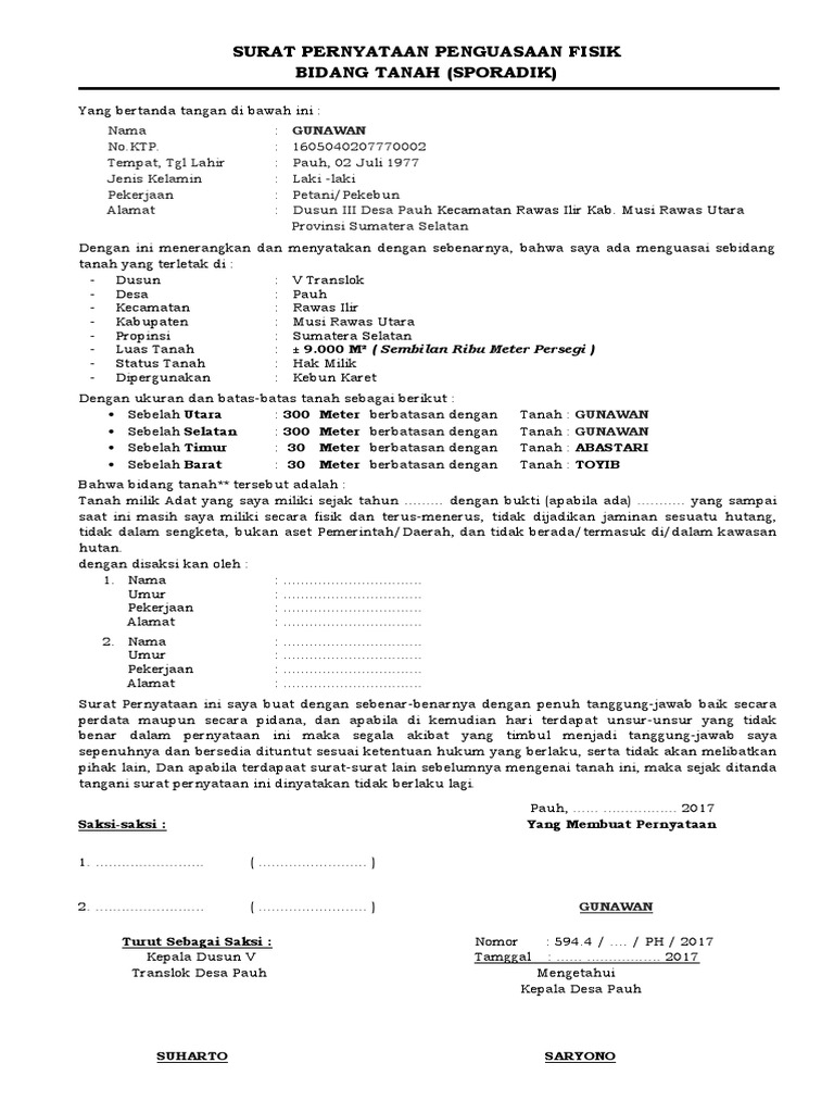 Contoh surat sporadik tanah. Surat pernyataan penguasaan fisik bidang tanah sporadik. Surat edaran kakanwil bpn propinsi sumbar no. Bidang tanah tersebut peroleh dari nnn sejak tahun 1997 melalui cara jual beli sesuai dengan surat keterangan pemindahan hak tanah jual beli. Surat pernyataan penguasaan fisik bidang tanah sporadik memang salah satu produk yang dikeluarkan oleh desa atau kelurahan yaitu dengan membubuhkan tanda tangan kepala desalurah di suratnya serta mencatatkan di buku register kelurahan. Apakah boleh kepala desa mebuat sporadik tanah dan seperti apa kekuatan hukumnya. Contoh surat sporadik dan surat surat dinas surat dinas model surat sporadik surat tanah pelepasan hak.
